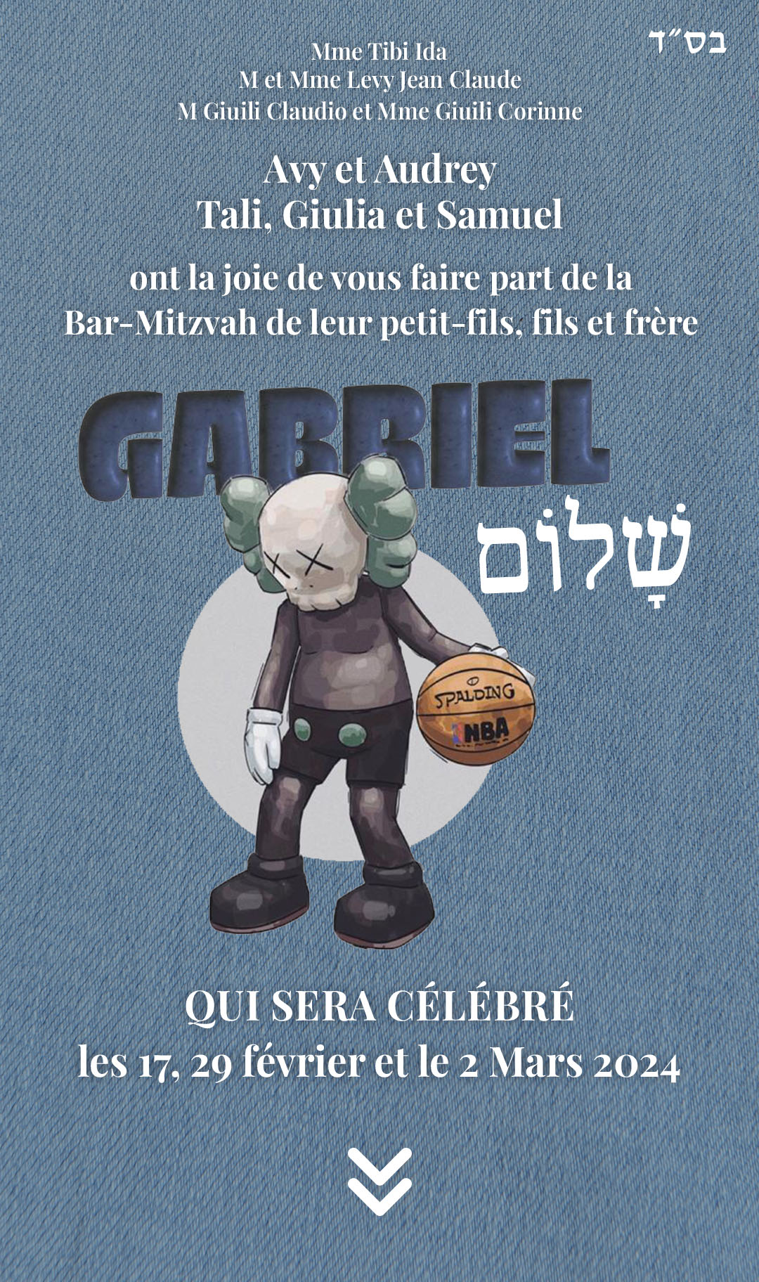 Nous serons heureux devivre ce moment avec vous leJeudi 29 février à 8h30 précisesLecture de la Paracha Ki tisaà la Synagogue Mesnil29 rue mesnil 75016 Parisla cérémonie sera suivi d’un petit déjeunerService voiturier